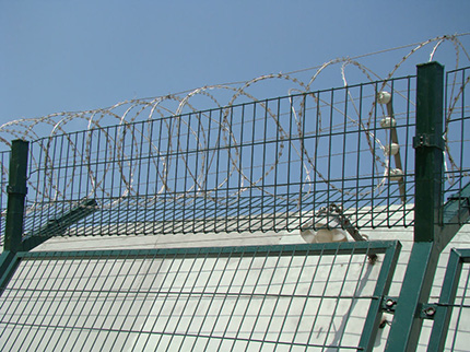 監獄防護網主要是采用高強度的刀片刺網與普通防護網的結合,V型支架立拄,加強型焊接片網,安全防盜連接件和刀片刺網組成.刀片刺網是一種新型防護網,由銳利尖角鍍鋅鋼板或不銹鋼薄板做刀片,鋼絲做芯線組合而成的防護器材。